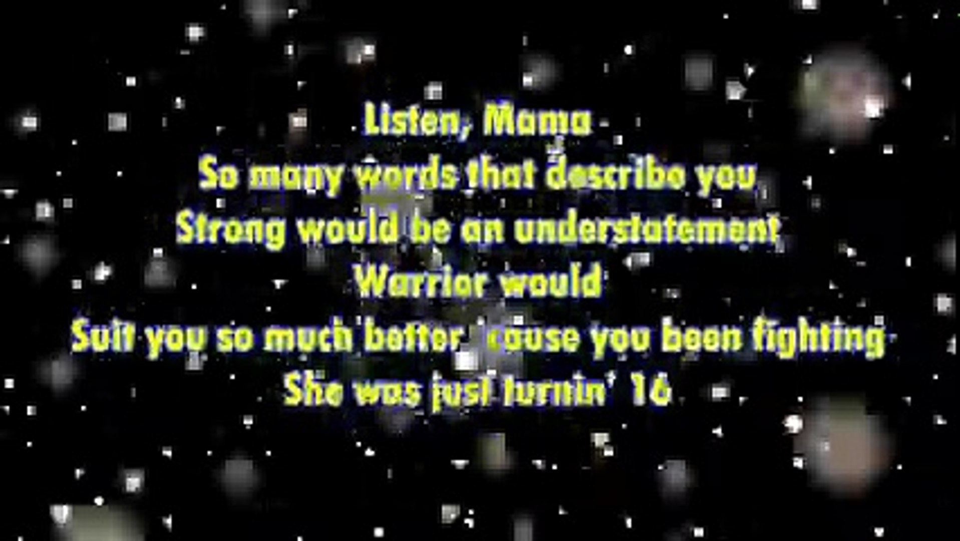 Mama I love you mama mama mama I do love you. Mama I love you mama mama mama I do love you. Mama I love you Mama-mama-mama I do love you Mama I love you Mama-mama-mama I do love you Listen mama so many words to describe you Strong would be an understatement Warrior would suit you so much better Cause youve been fighting Seen so much beauty from within You didnt have to give but you gave it So special I just wanna take this time to let you.